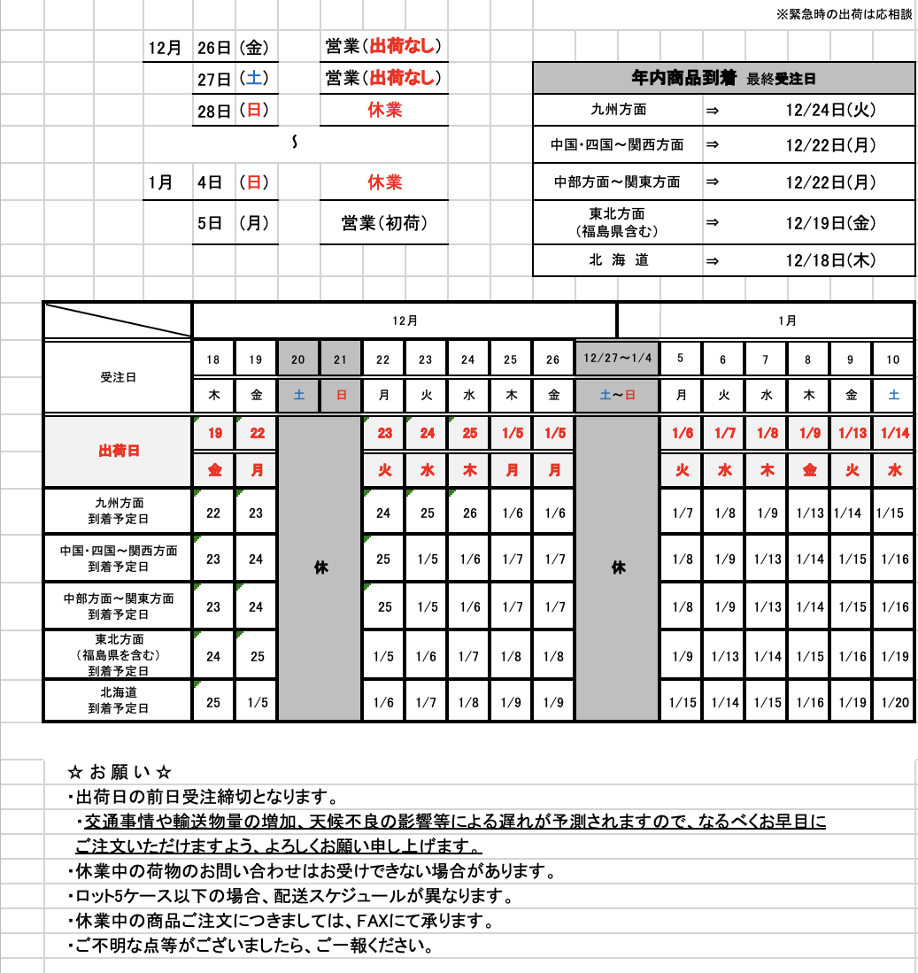 さて、弊社では下記の通り年末年始をお休みとさせていただきます。年末・年始の配送につきましては、下記事項を予定しておりますが、変更の場合がございますので、ご了承ください。