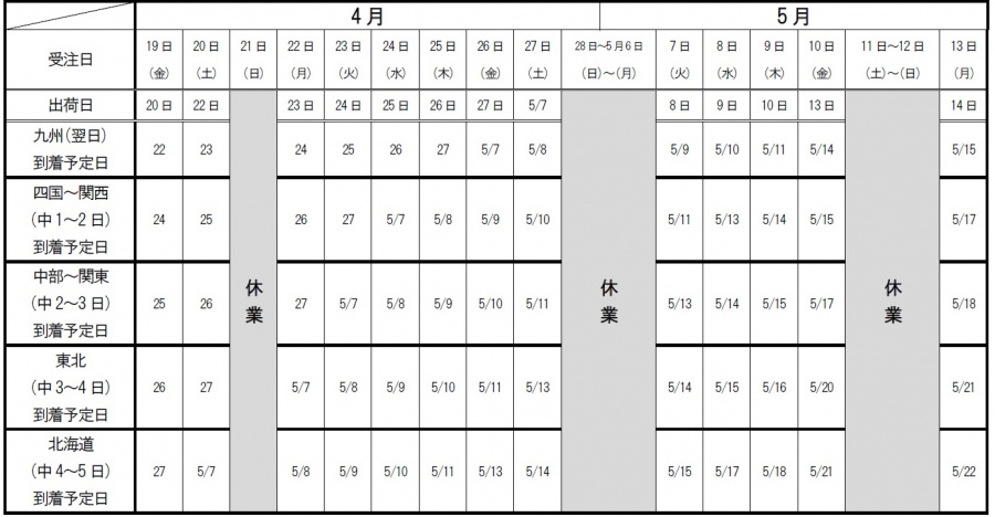 GW期間/配送スケジュールのご案内(少し変更がございます)